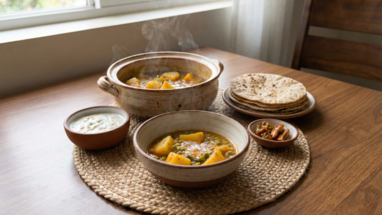This comforting Aloo Matar curry is a classic homestyle dish made with potatoes, peas, and a slow-cooked onion-tomato masala. Cooked