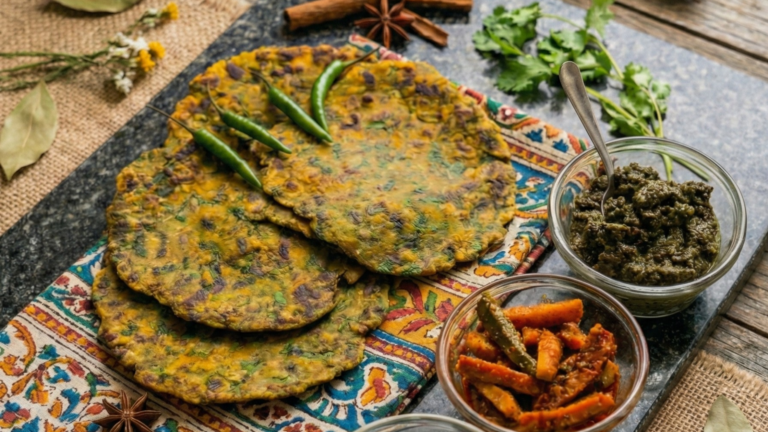 This traditional methi roti is a wholesome and flavourful Indian flatbread made with fresh fenugreek leaves, spices, and yogurt. Soft