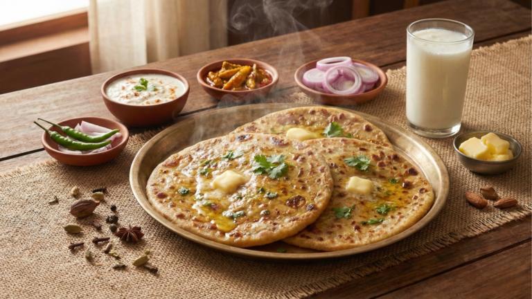 This traditional Gobi Paratha is made the authentic grandma’s way using freshly grated cauliflower, onions, and aromatic spices. The stuffing
