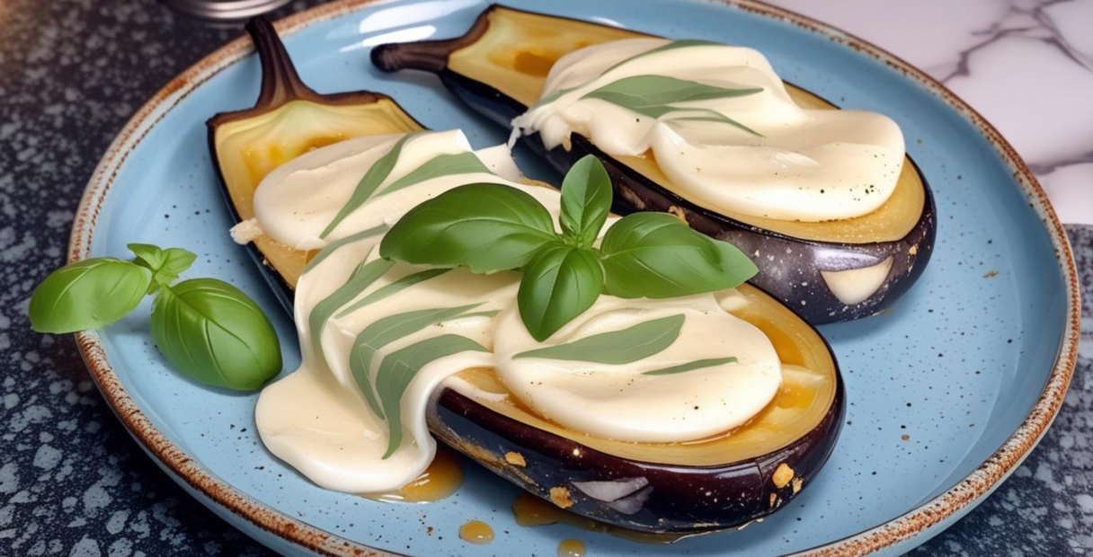 Remove the roasted eggplant from the oven and gently mash the flesh inside each piece to create space for the filling. Spoon the tomato mixture evenly over the eggplant, spreading it gently so it absorbs into the soft flesh. Tear or slice the mozzarella cheese and layer it generously on top, then finish with fresh basil leaves.