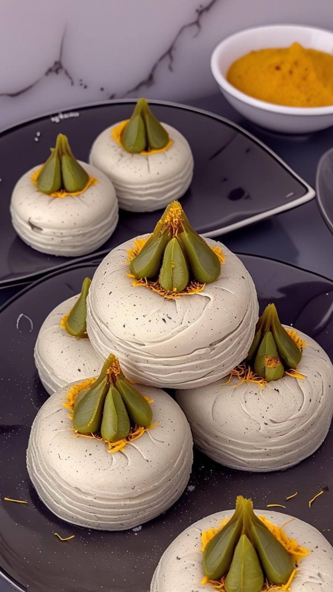 Once the mixture has cooled for five to ten minutes, knead it again until smooth. Roll into a log, divide into small portions, and shape them into neat balls. Press gently with your fingertip, add a touch of saffron color, and garnish with pistachios before serving.