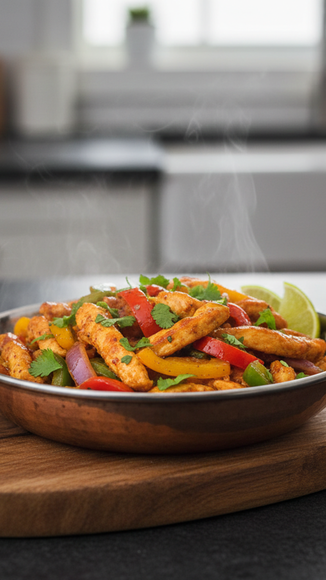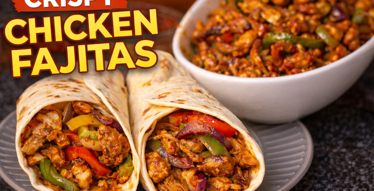These crispy chicken fajitas cooked in a karahi are quick, flavour-packed, and perfect for wraps. Juicy chicken strips are stir-fried with crunchy peppers, onions, and tomatoes, then finished with a tangy soy, lemon, and chilli sauce mix for a delicious fusion twist.