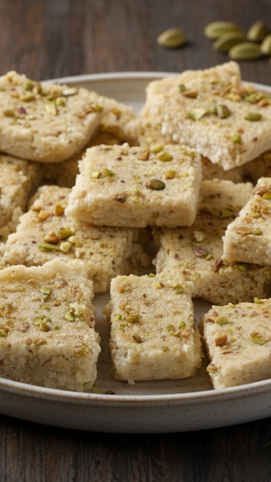 Add chopped cashews and cardamom powder, mixing well to distribute evenly. Transfer the mixture into a greased and lined tray, level the surface, and sprinkle crushed pistachios on top. Allow it to cool and set for about forty minutes before cutting into slices and serving.