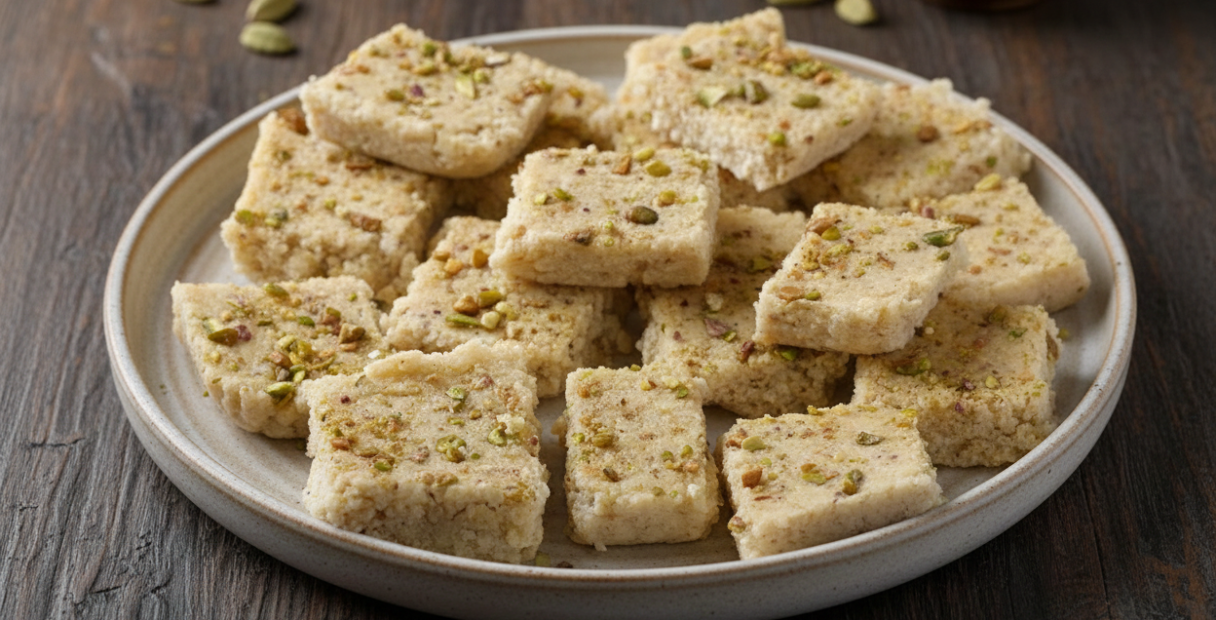 Kalakand is a classic Indian milk sweet made by slow-cooking full cream milk until thick and combining it with softly mashed paneer, sugar, and aromatic cardamom. This homestyle version has a delicate crumbly texture with rich dairy flavour, finished with nuts for a traditional festive touch.