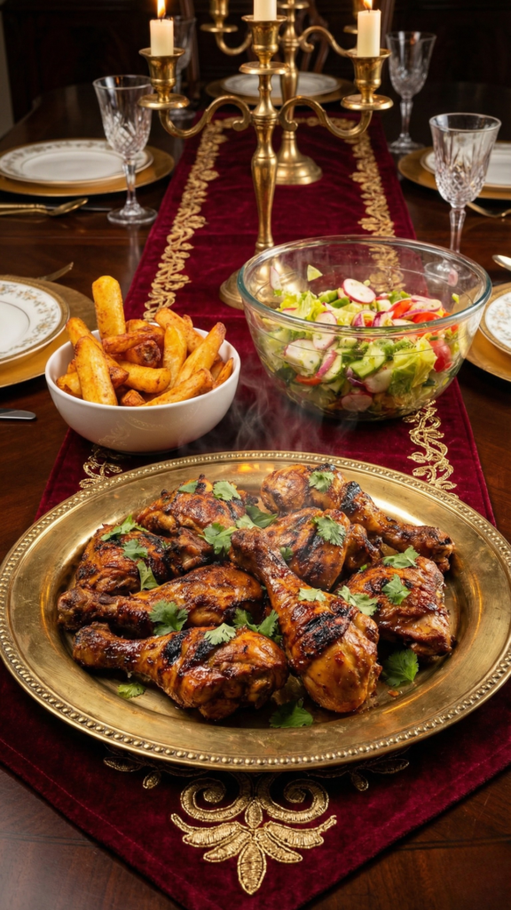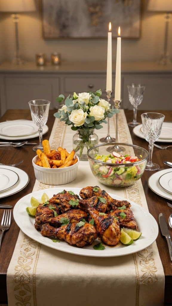 Bake the chicken at 190°C for 50–60 minutes, checking occasionally. Remove the foil for the last 10 minutes if you prefer a slightly charred finish.