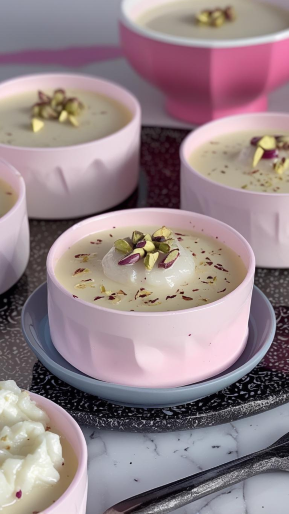 Gently squeeze excess syrup from the paneer balls and add them to the prepared milk. Garnish with chopped pistachios and extra saffron.