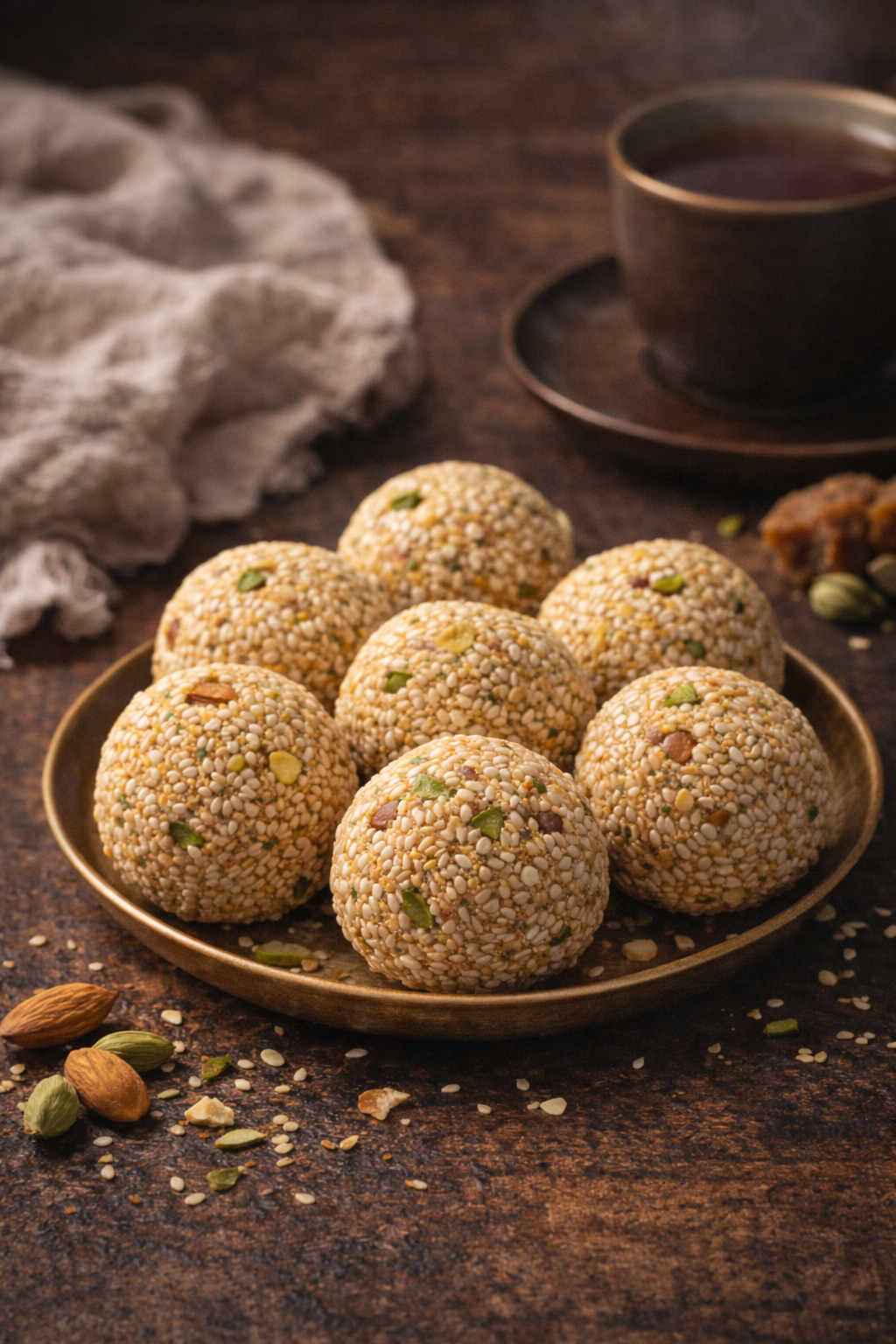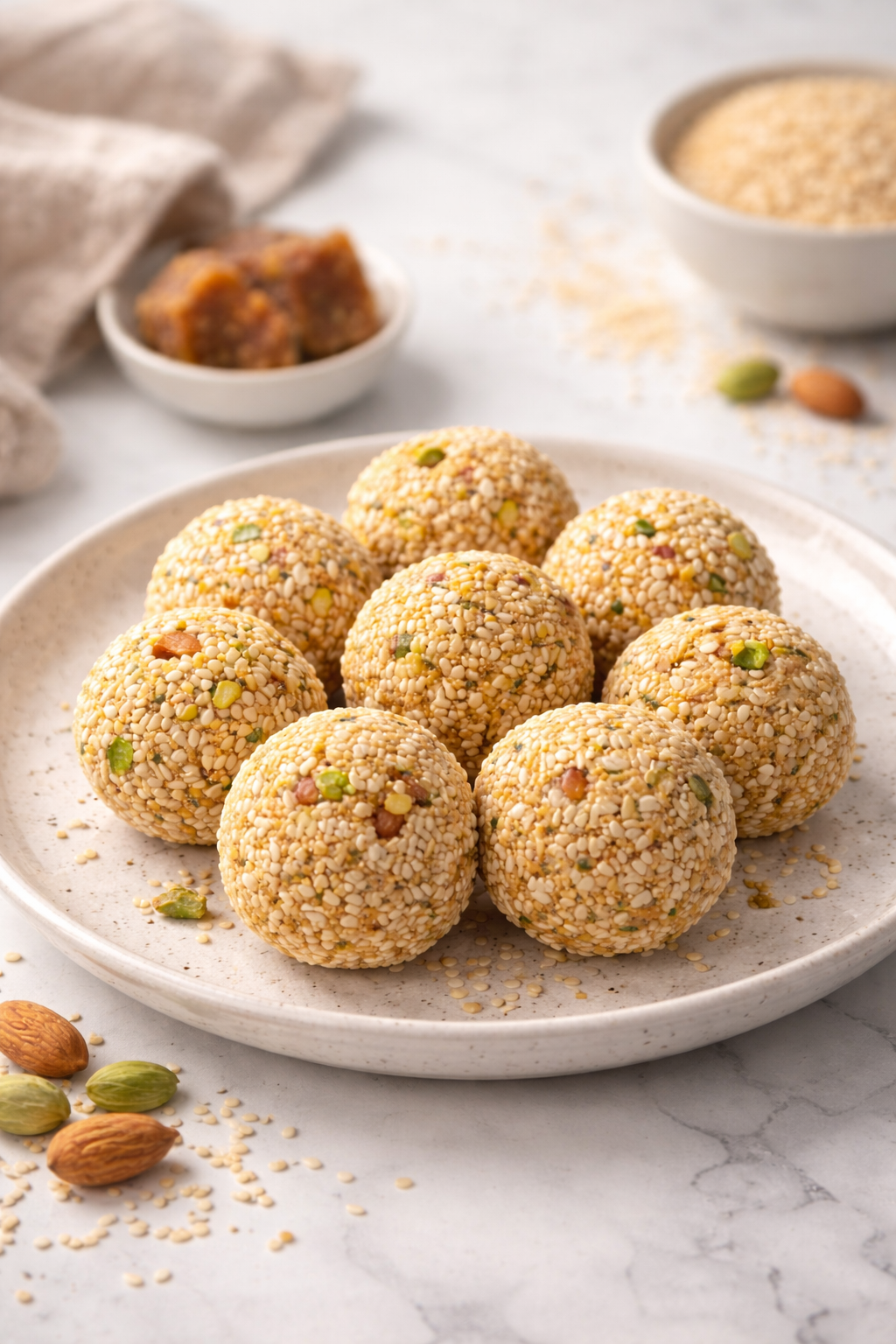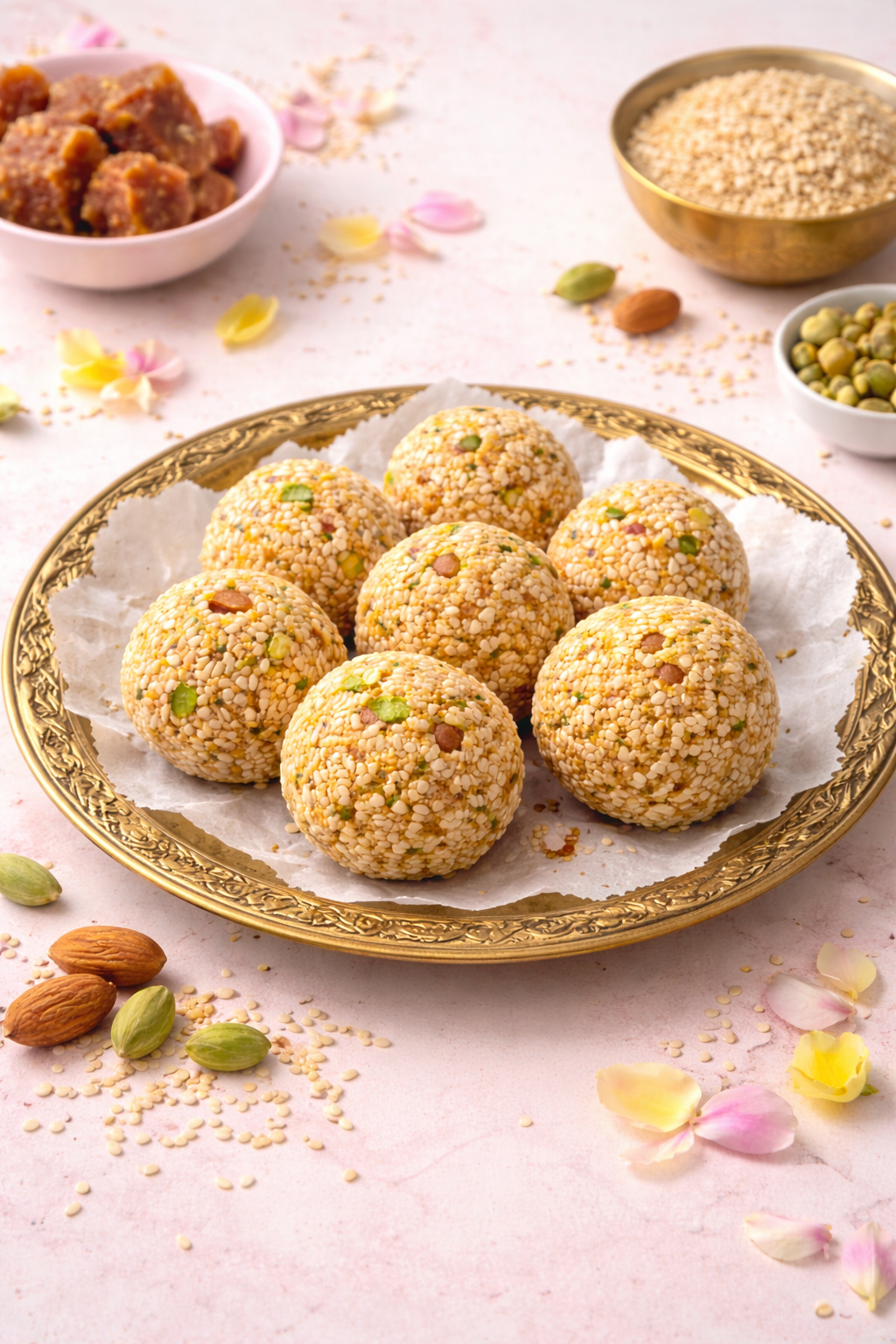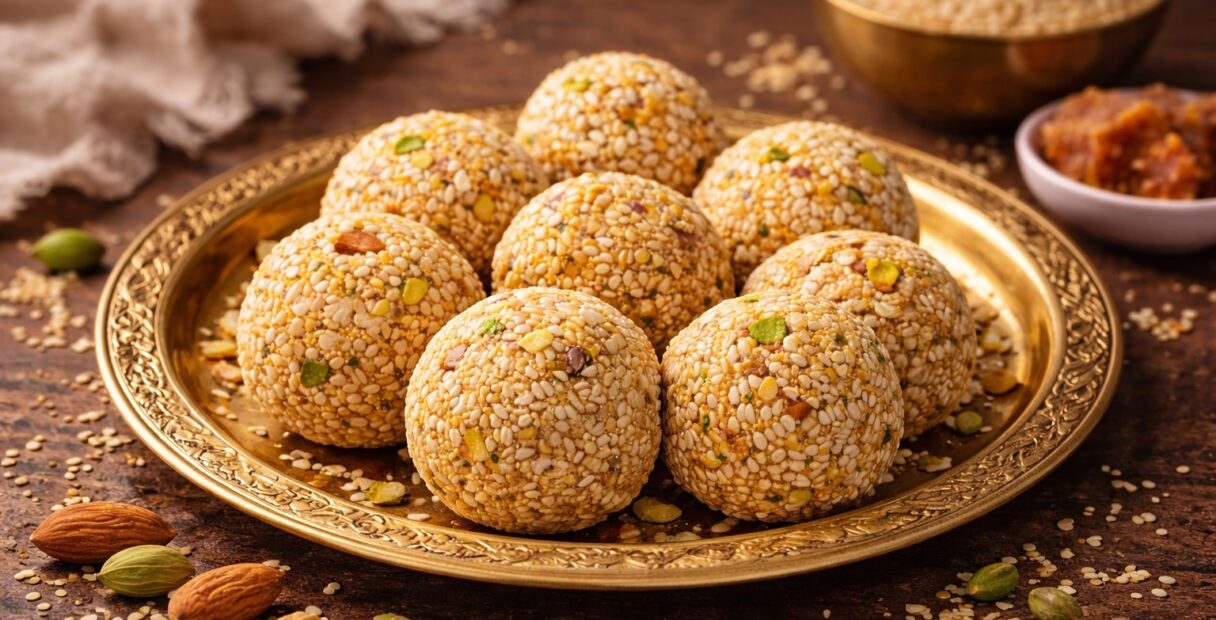 Sesame Seeds Laddu is a traditional homemade sweet made with roasted sesame seeds, jaggery, mixed nuts, and aromatic cardamom. These laddus are wholesome, naturally sweetened, and perfect for festive occasions or as a nourishing snack. The combination of toasted sesame and jaggery creates a rich, nutty flavor with a soft yet slightly chewy texture.