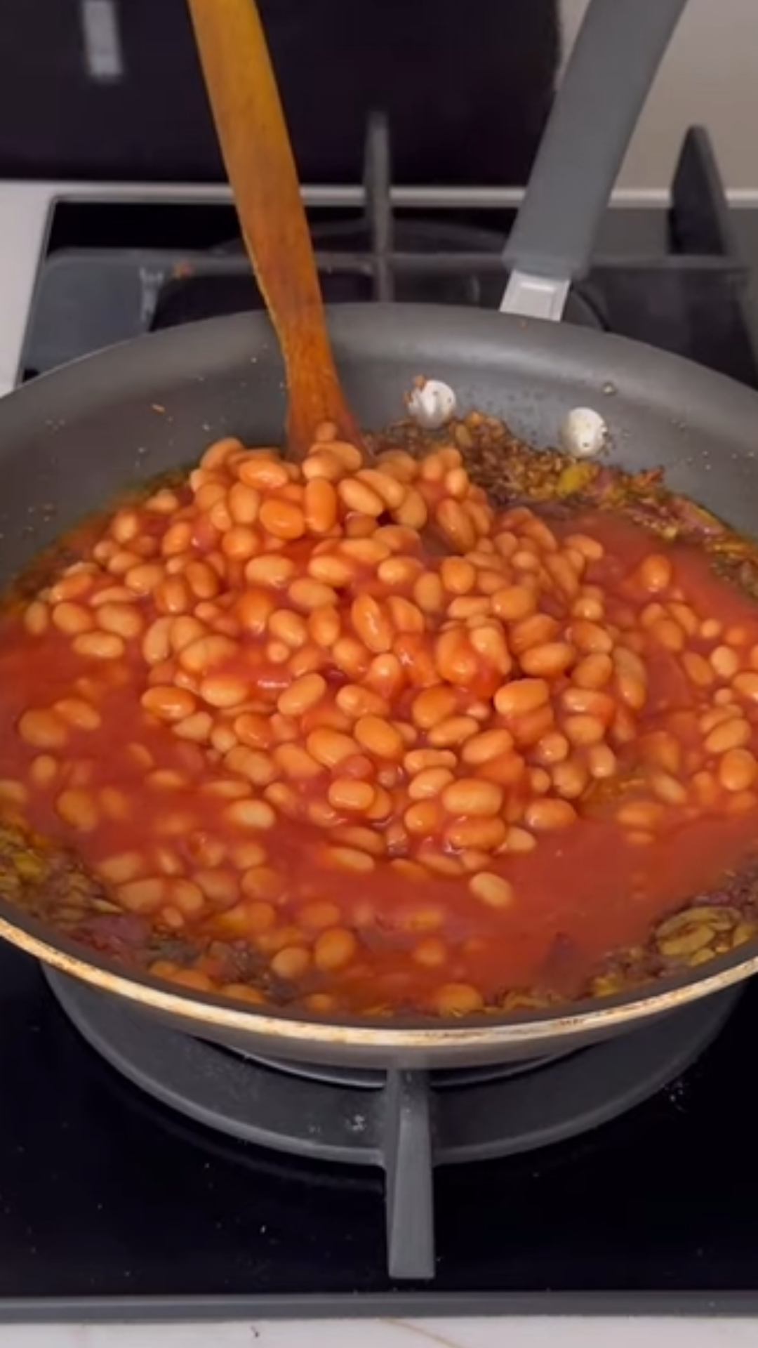 Add the baked beans and stir well to coat with the spices. Cook for a few minutes until heated through.